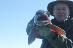 Regarding these monster lakers, these are all referred to as the grey or blueback lake trout. This is but one species in GBL, but there are really at least seven distinct species of lake trout in GBL. Another species that was present is the redfin or butterfly lake trout. This species is only found is very specific areas of the lake. The redfin only grows to a top weight of about 20-pounds, but a species of this weight will be over 50-years old. These slow growers exhibit their age by the size of their fins, and in particular their pectoral fins. For these fish, the pectoral fins are about the same length as the height of the fish at its deepest girth, which makes them huge. In addition, they turn blood red. The Redfin also has thousands of small white spots.